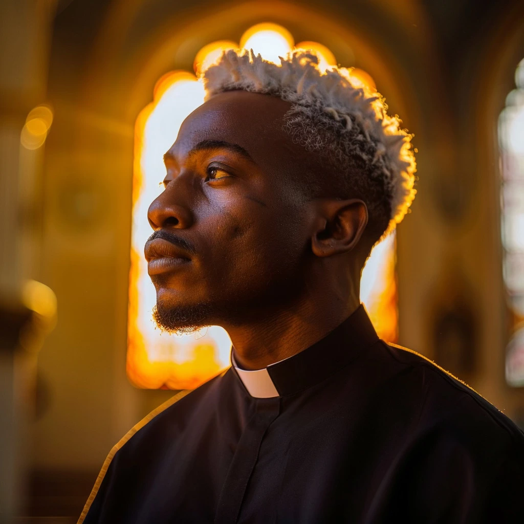 Cinematic 스타일의 흰머리 중년 흑인 남성 성직자의 모습을 요청하였다. 카메라 렌즈를 바라보는 구도를 탈피하기 위해 옆모습 연출을 시도하였다. 주변 상황 연출은 Golden Hour의 Side light로 설정하였고 50mm 화각과 1:1 정방형 비율을 설정하여 게임 프로필의 느낌으로 설정하였다.