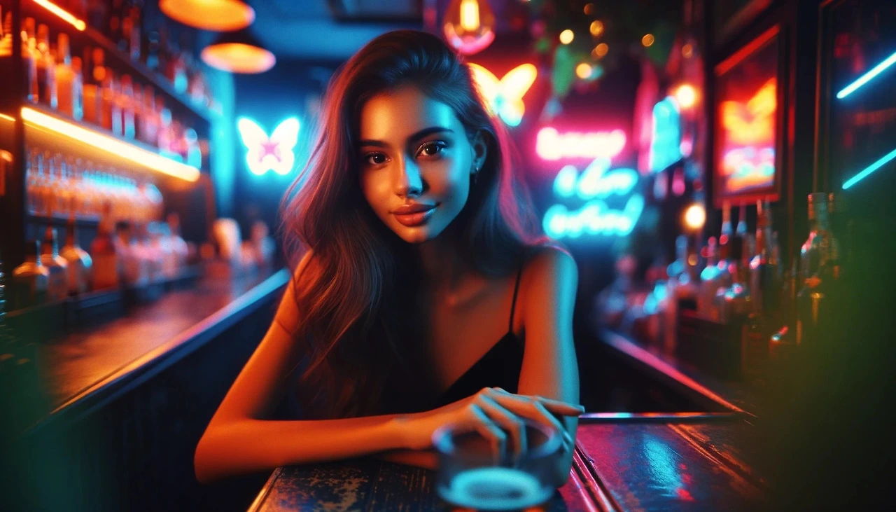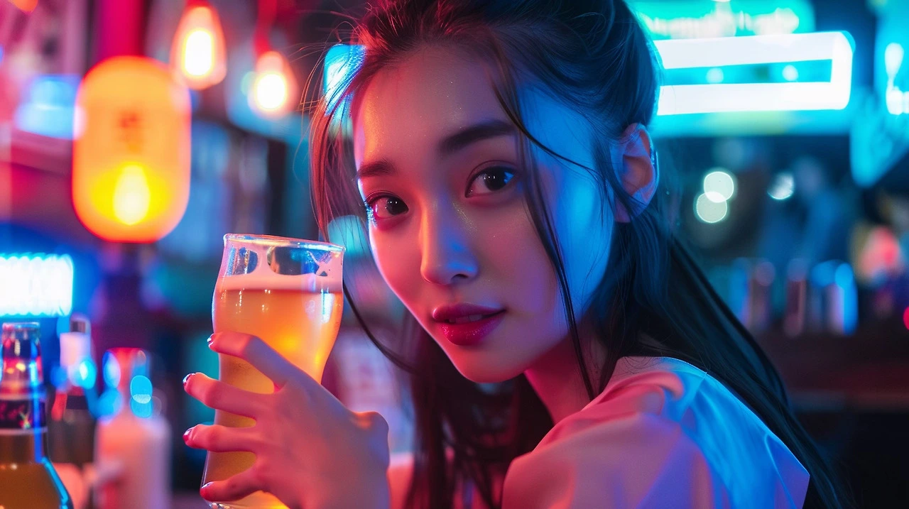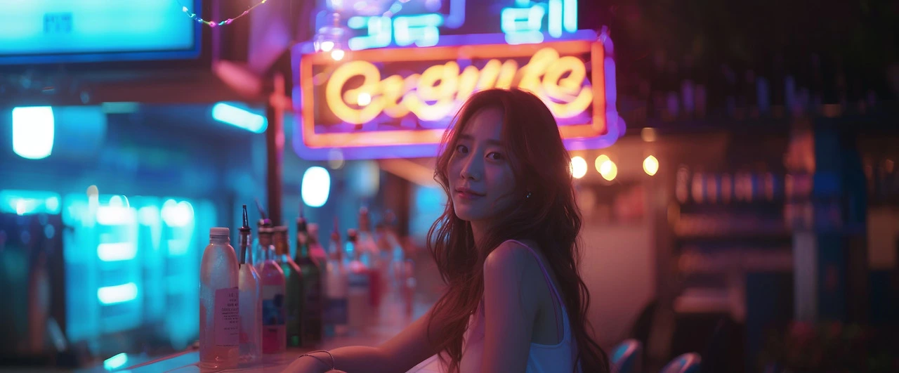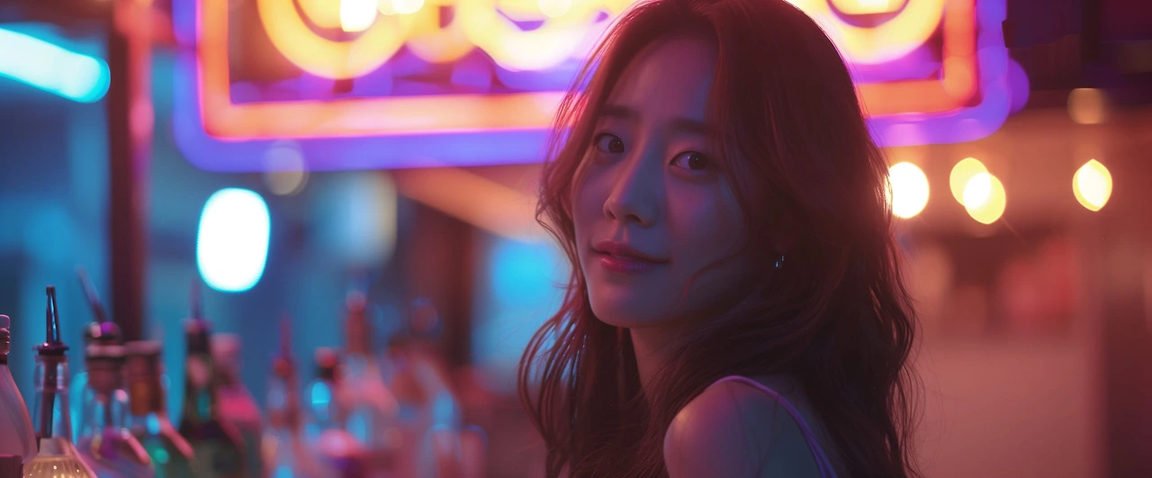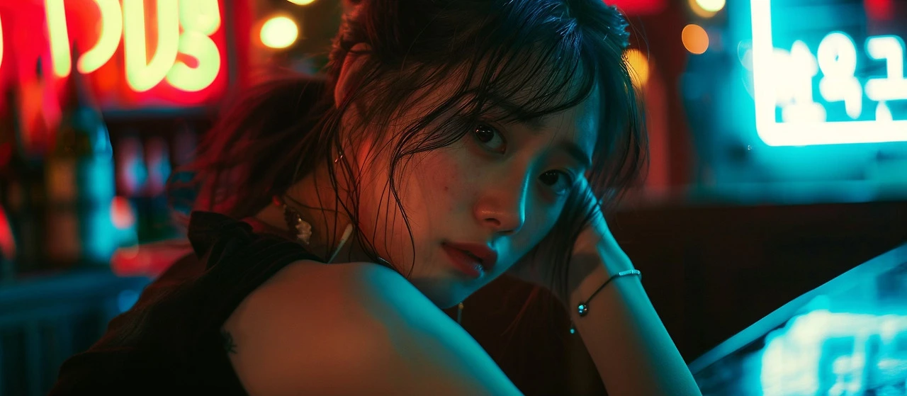 다양한 광원과 환경 내에서 각각의 인물을 어떻게 표현해 내는지에 대한 연구가 필요하겠다. 우선, 비슷한 네온 조명 환경의 실내에서의 결과물을 요청하였다. Cinematic 스타일로 네온 조명의 바에 앉아 있는 한국의 20대 여성이 관객을 쳐다보는 장면을 입력하였으며 50mm 렌즈의 아나몰픽 비율을 활용하여 영화관 스크린의 배우가 관객을 눈앞에서 바라보는 것과 같은 장면을 연출하였다.