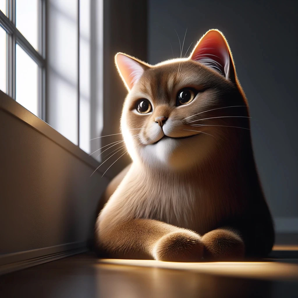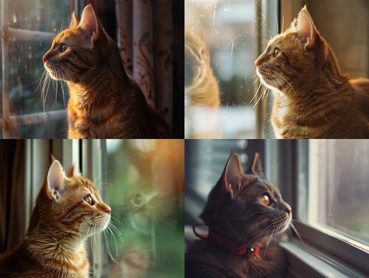 먼저 Photo realistic 스타일의 귀여운 갈색 코리안 숏헤어 고양이가 창밖을 바라보고 궁금해하는 표정을 side light 연출로 부드럽게 표현하도록 요청하였다. 50mm 렌즈로 클로즈업 앵글을 연출하여 고양이가 눈앞에 있는 듯 표현하였다.