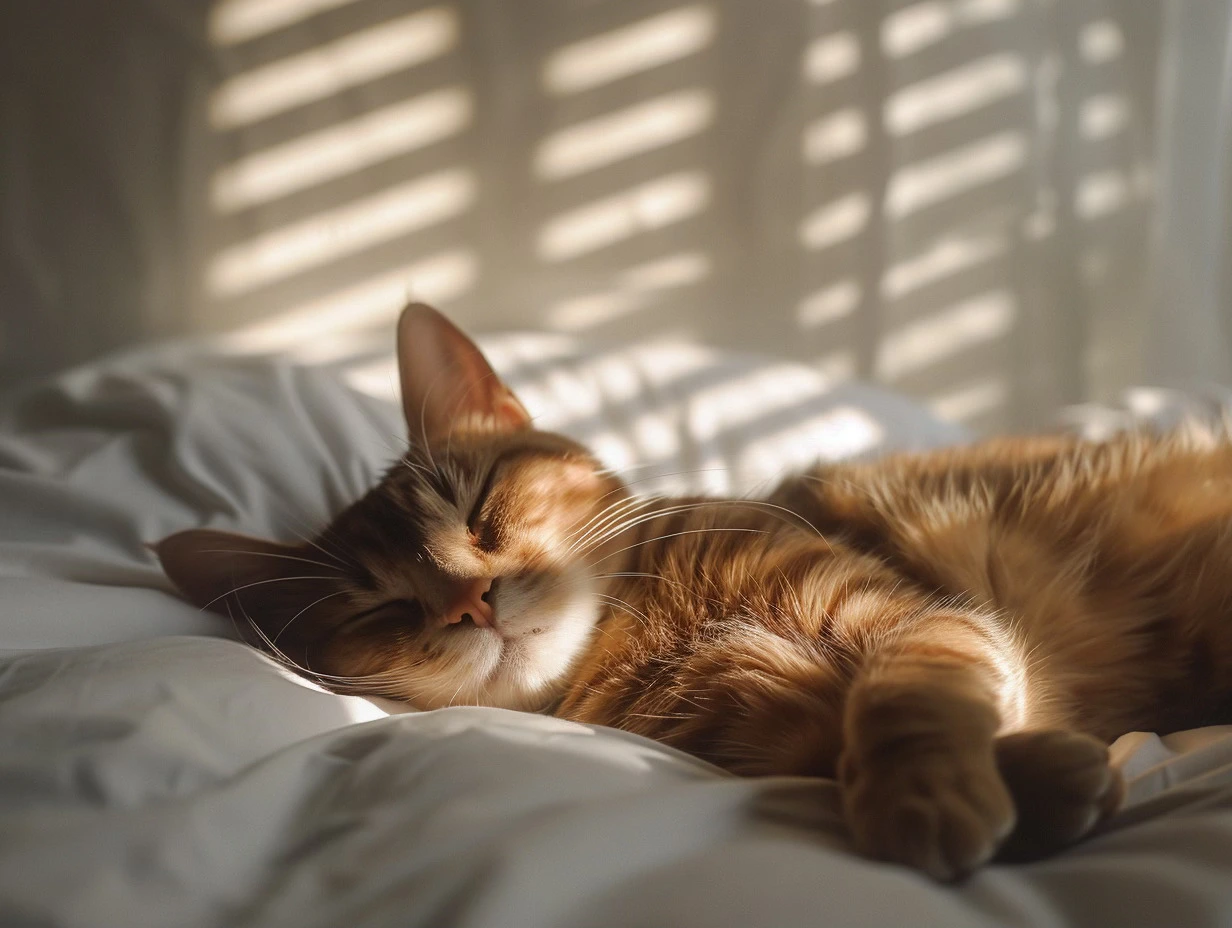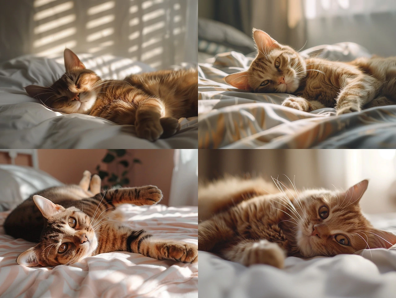 심도에 대한 구체적인 요청사항이 없었음에도 눈앞에서 접사 촬영을 한 듯 깊은 심도 표현을 보여준다. 위에서 다른 창밖을 바라보는 고양이의 표현과 마찬가지로 유사한 구도에서 서로 다른 색감과 약간씩 다른 모습의 피사체를 표현하였다. 배경에 대한 구체적인 묘사가 없었음에도 실제 사람이 거주하는 방과 침구류의 모습을 놀라울 만큼 자연스럽게 표현하였다.