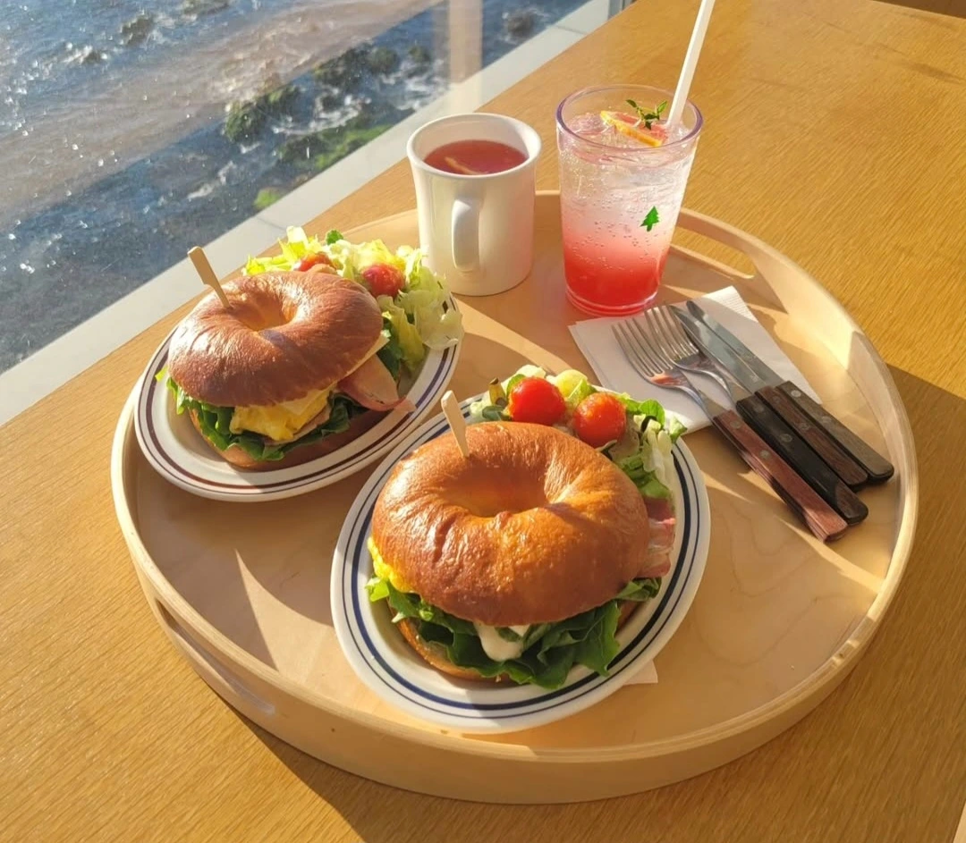 아침 식사는 풀빌라 바로 옆 카페에서. 눈부신 윤슬을 앞에 두고 샐러드와 샌드위치를 먹었다. 오션뷰로 유명한 대형 카페인데, 풀빌라 숙박객에게는 카페 오픈 시간 전에 조식을 제공한다. 커다랗고 텅 빈 카페를 둘이 독차지할 수 있는 잠깐이 한껏 즐거웠다.