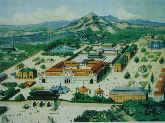 조선물산 공진회라는 이름의, 지금으로 따지면 엑스포가 열린 것도 이 즈음, 1915년입니다. 총독부 건물은 아직 지어지지 않았지만 광화문에는 일장기가 걸려있고 경복궁 내부의 대부분의 건물들이 파괴되어 있음을 알 수 있습니다. 삽화는 당시 배포되었던 홍보자료의 일부.