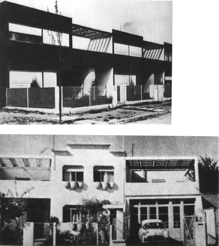위가 건설 당시의 페싹 주거단지고 아래가 거주민들이 원하는 데로 집을 고친 사진입니다. 정돈되고 퓨어한 모더니즘 건축의 맛은 온데간데없습니다. 가늘고 긴 창은 가운데를 막아 보통의 창으로 바뀌었으며 1층 필로티 공간은 더 이상 외부공간이라 할 수 없는 보통 가정집의 1층이 되었고, 편편했던 지붕은 가운데 부분을 올려 자잘한 멋을 냈습니다. 사진 출처 : Philippe Boudon, 1969, "Pessac de Le Corbusier", Dunod