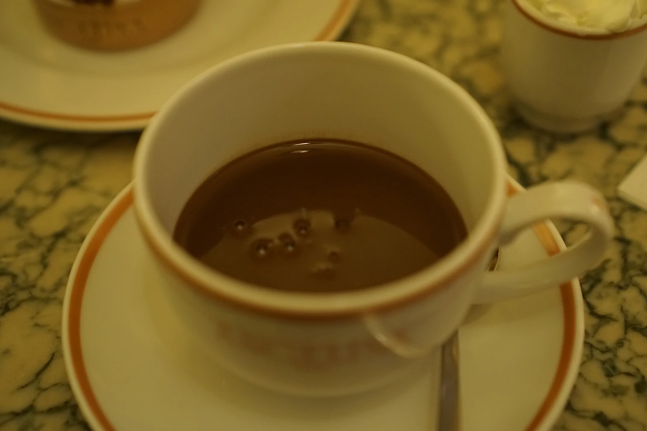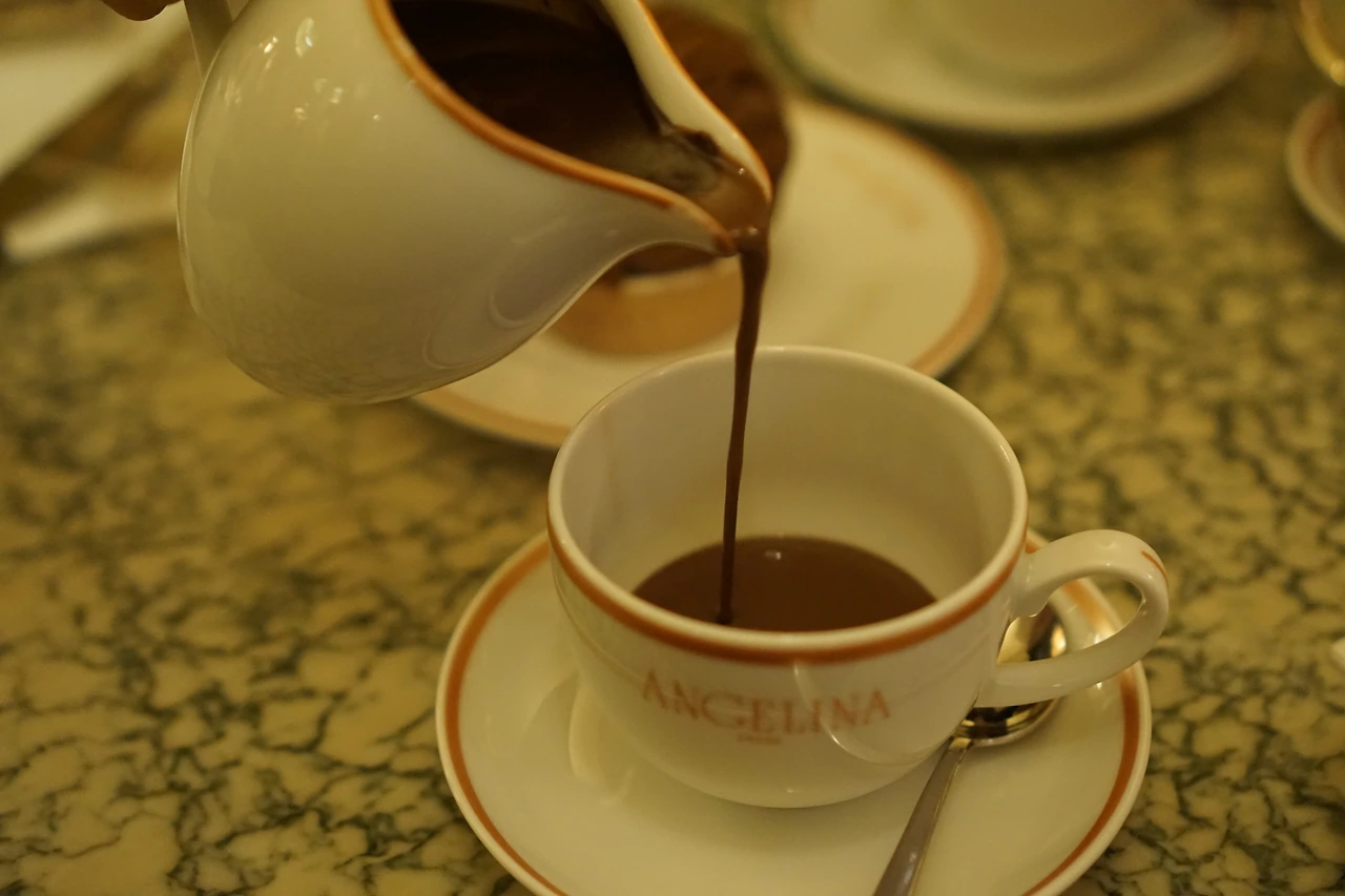 몽블랑과 함께 시켜야 할 메뉴 쇼콜라쇼. 초콜릿을 통째로 녹였다고 해도 과언이 아닐 만큼 진하다. 특히 앙젤리나의 쇼콜라쇼는 몽블랑만큼이나 유명하다. 단, 이 두 가지를 함께 먹으면 너무 달기 때문에 홍차를 꼭 시키길 추천한다.