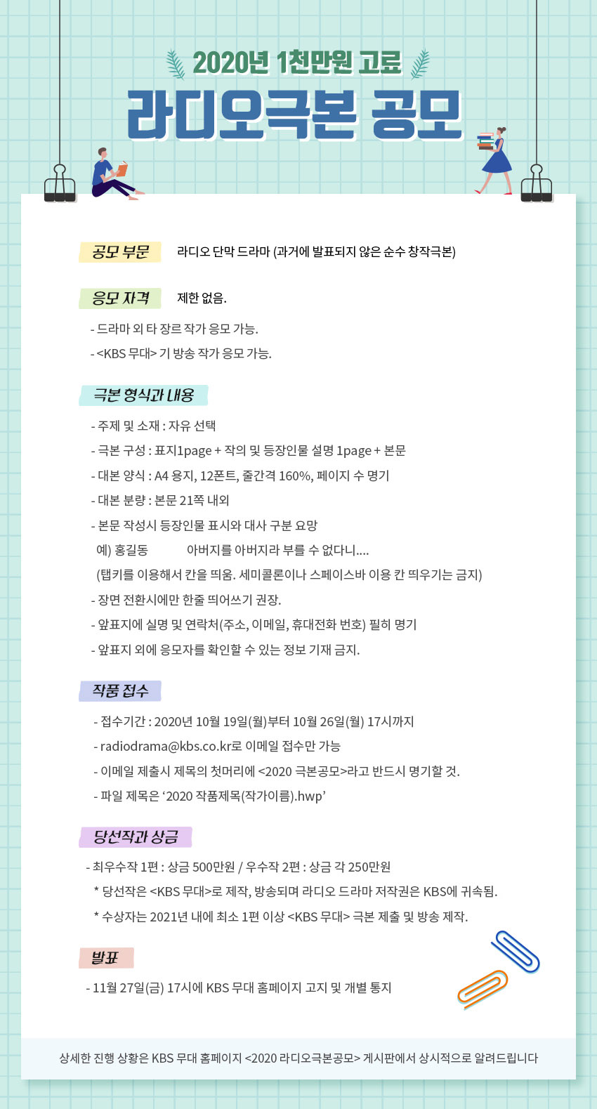 라디오 작가가 되는 가장 확실한 길은 방송사의 공모전에 있습니다. KBS 라디오에서는 해마다 <KBS 라디오 단막극 공모>를 합니다. 순수 드라마만 공모할 때도 있고 다큐 드라마를 병행해서 뽑기도 합니다. 라디오 드라마는 50분 내외 순수 창작 단막극으로 주제는 자유이고 방송에 적합한 내용이면 됩니다. 분량은 200자 원고지 100장 내외, A4 용지 12 폰트 21페이지 정도입니다. 표지에 작의(作意). 등장인물 설명 별도로 기술하면 되고요.