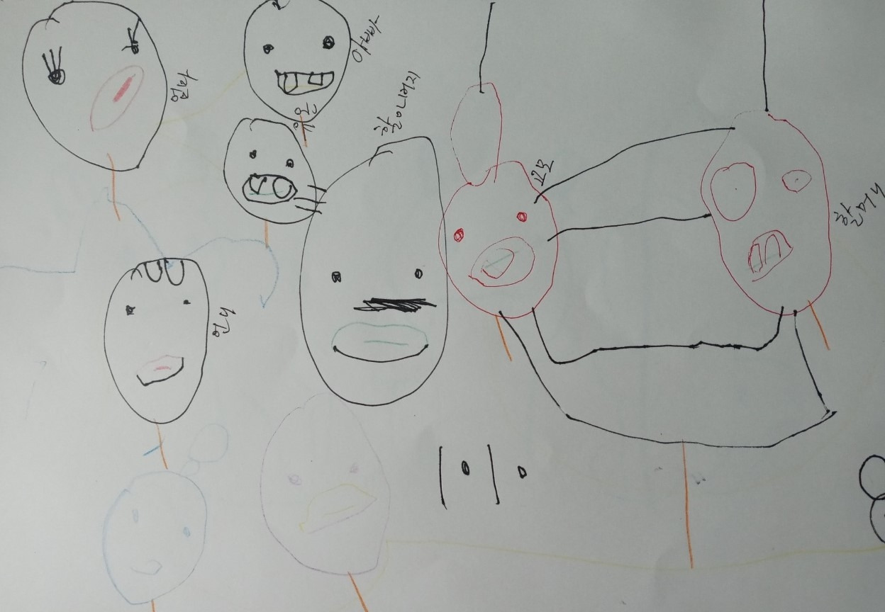 할머니는 커서 뭐가 될 거냐고 묻는 네 살 짜리 <유온> 작품입니다. 이 그림을 그리면서 많은 이야기를 풀어놨습니다. 받아 적었으면 아마 드라마 시놉시스였을 겁니다. 고모와 할머니를 잇는 선은 둘이 손을 잡고 있는 것이고요. 할아버지와 유온이가 붙어 있는 건 지금 이야기를 나누는 중이랍니다. 이름을 쓴다고 '이'를 '10'으로 썼습니다.