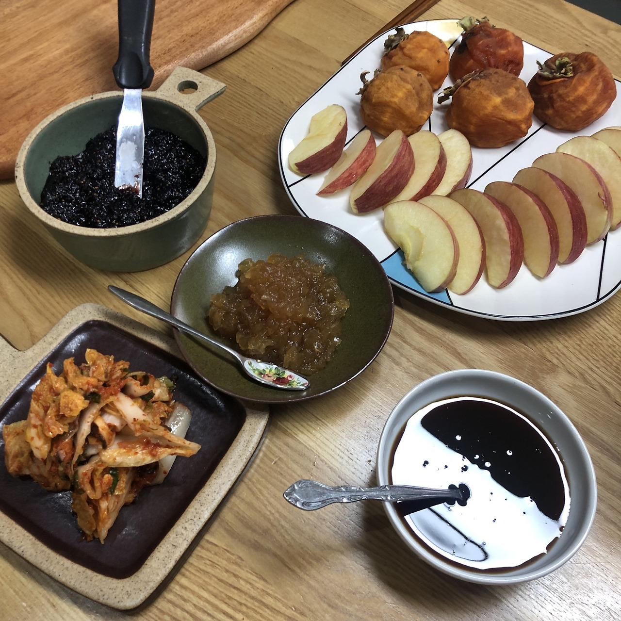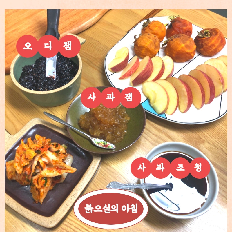 마을 주민이 직접 만든 오디잼과 사과잼과 사과 조청 그리고 마을에서 생산된 과일까지. 혹시나 모를 반찬. 김치까지. 준비된 붉으실 마을 브런치.
