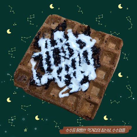 수수를 활용한 최신상 브런치. 수수 와플. 내가 선택한 와플 토핑은 오디잼과 콩크림이었다. 나는 이것을 우리 가족에서 꼭 먹여보고 싶었다. 오디잼과 콩크림은 아직 팔지 않아 살 수 없었지만, 핫케이크/와플용 수수가루는 주민모임센터 '마실'에서 구매하였다.