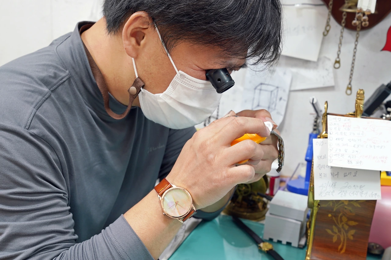시계를 고치는 일은 참 예민한 작업이다. 눈에 확대경을 끼고 작은 부품을 들여다보기를 1시간 남짓. 잠시 눈에서 확대경을 빼고 나면 몇 초간 앞이 보이지 않는다고 했다.