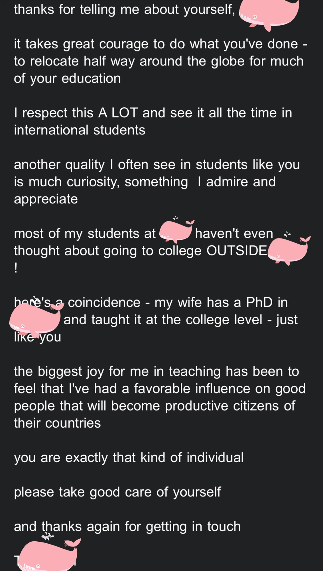 P교수는 미국인들은 본인이 사는 주(state)를 벗어나는 거 조차 싫어하는데 나처럼 교육을 위해 이역만리를 떠나 타국에서 생활하는 학생들을 존경하며 나 같은 학생에게 좋은 영향을 주어 기쁨을 느끼고 연락을 주어 다시 한번 고맙다고 했다.