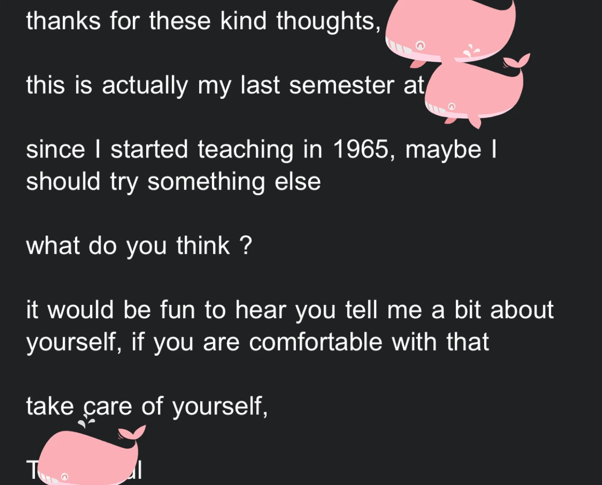 위의 내용을 종합하여, 당신은 내게 아카데믹한 감동을 주었다, 졸업 후 몇 년이 지난 지금도 좋게 기억된다, 내게 좋은 교수, 좋은 학창시절의 기억을 만들어주어 고맙다 라는 메일을 보냈더니 이번 학기가 P 교수의 마지막 학기이며 1965 년부터 일해왔다고 퇴직을 앞두고 뭐를 하면 좋을지 그리고 나에 대해서도 소개를 해달라는 내용이었다.