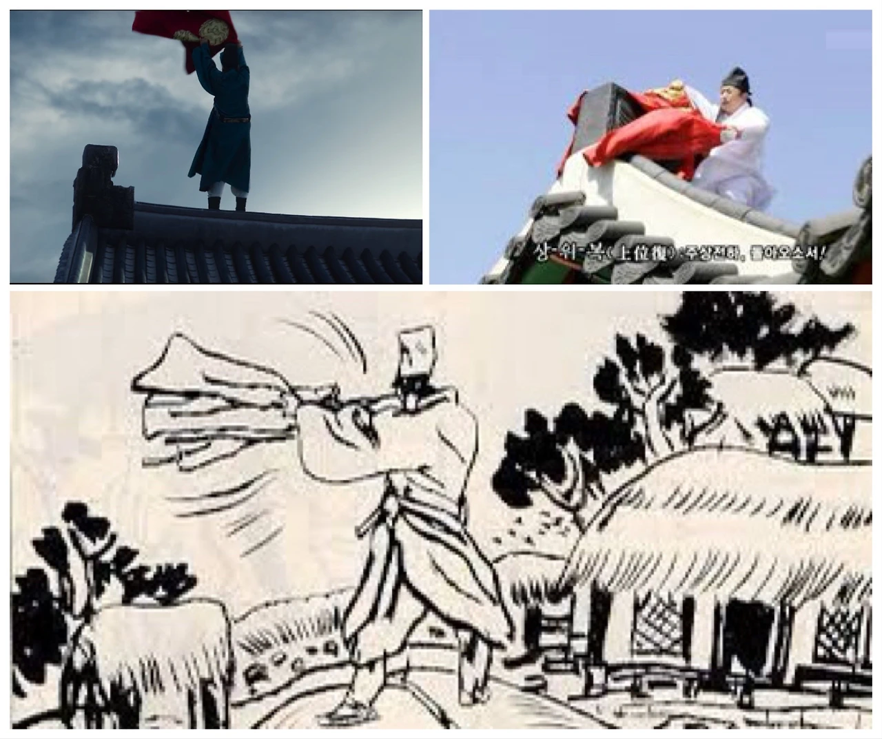 다른 말로 고복(皐復) 의식이라고도 하고, 사람이 죽었을 때, 그 혼을 소리쳐 부르는 행위를 합니다. 남은 자들의 마지막 미련의 최선을 다하는 의미입니다. 망자가 생시에 입던 저고리를 왼손에 들고 지붕에 올라서거나 마당에 서서, 북쪽을 향해 "아무 동네 아무개 복復"이라고 세 번 부릅니다. 주로 사극에서 왕이 사망하면 내관이 궁궐 지붕에 올라가 곤룡포를 세 번 휘두르며 상위복 하고 외치는 행위가 바로 초혼의 대표적인 모습입니다. 이 초혼, 고복의 울음소리와 비슷하다고 하여 소쩍새를 '초혼조'라고도 합니다.