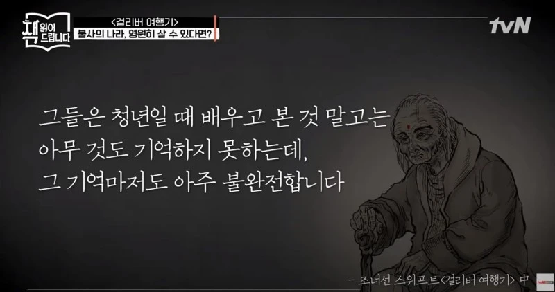 그 유명한 <걸리버 여행기>의 걸리버는 소인국, 대인국, 라퓨타를 지나 '스트러드블럭'이라는 곳에 당도한다. 이 나라 사람들은 죽지 않는다. 그저 80이 지나면 국가에서 이들을 '없는 존재'로 처리하는 것. 이들은 젊을 때 보고 배운 기억들만 유지하고 떠 올리며 80세 이후의 삶은 살아도 산 것이 아닌 영겁의 시간을 보낸다. 그 기억마저도 완전치 못한 인지저하의 상태로 재산도 국법으로 죽은 자가 되어 모두 상속하고 겨우 연명할 것만 나라에서 보장해 준다. 이런 사회가 이제 현실감 있게 다시 보인다.