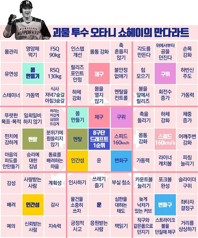 올해 미국 메이저리그를 평정한 일본의 야구 스타 오타니 쇼헤이의 팔방형 미래 계획이 유행처럼 떠돌았다. 이미 수 년 전에 나돌던 이야기가 새로운 것은 없어 보인다. 그러나 그 안의 실체들을 얼마나 따져 보았는지 되묻고 싶다. 어려서부터의 확고한 방향의 설정과 그 달성을 위한 고된 노력의 시간은 그의 잘생긴 얼굴과 엄청난 체격에 가려지고 말았다. 그리고 시스템과 근본의 대책이라는 것이 ‘대표팀 평가전 확대’라니 할 말이 없어진다. 필요한 것은 학생 선수들의 수업권과 선수 이전에 최소한의 자기 수양이 가능한 학습 능력을 배양하는 데에 있는데도 말이다. 한국의 야구계에서는 인수분해 한 번 해보지 못한 사람이 세이버메트릭스라는 비교 통계 지표를 거들먹거리고, 뉴턴의 법칙도 모르면서 회전과 각도의 역학을 이야기한다. 이 모든 것이 NG다.