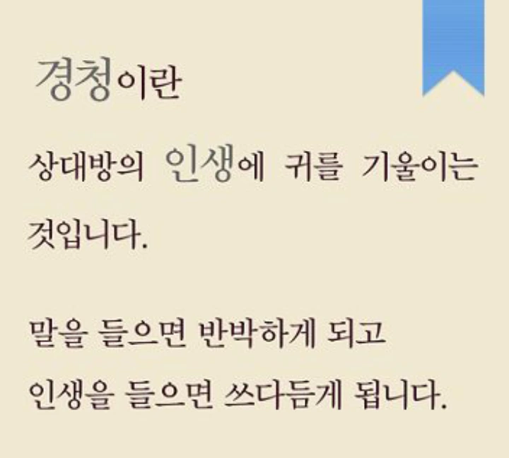 보다 성숙한 사람이 되기 위한 '어른의 행동'에는 두 가지의 위밍업이 있다. 하나는 경청(敬聽)이고 다른 하나는 그 공경스런 청취 뒤의 공감과 정립의 질문(質問)이다. 경청은 상대방의 말들 단순히 듣는 것이 아니다. '경(傾)'은 '기울이다'라는 뜻의 "상대에게 몸을 기울여 듣다"라는 의미를 주며, 이는 결국 상대를 존중ㆍ공경하는 마음의 '경(敬)', 즉 깊이 듣는 행위가 된다. 이런 의미에서 경청(敬聽)하는 보통 사람은 사실 찾아보기 힘들다. 성인, 군자의 반열에 든 몇몇만 기억에 있을 뿐이다. 그래서 필부, 평범인들이 할 수 있는 '경청(傾聽)'부터 노력해야 한다. '상대에게 귀를 기울이는 자세'부터가 그 시작이 될 것이니까.