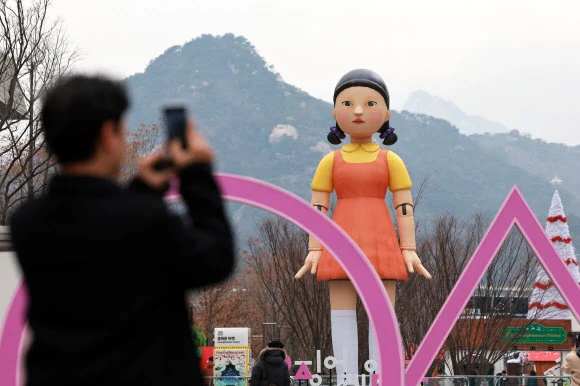 광화문에 등장한 <오징어게임>의 영희 (출처=서울신문)