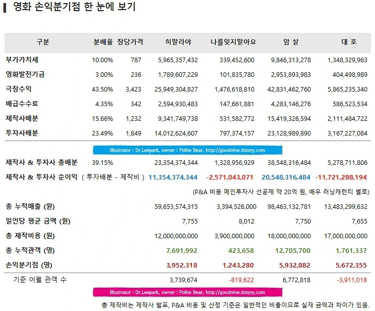 한국의 평균적인 투자:제작의 비율은 6:4로 조사된 바가 있다. 이를 통해 알 수 있는 것은 영화 제작비용 대비 손익분기를 가늠할 수 있는데, 보통 50억의 제작비가 든 경우 100만 명의 관객이 들어야 손익이 분기점을 맞이한다. 100만이 들어야 적자가 나지 않는다는 이야기다. 그러나 마케팅이나 기타 비용을 고려하면 100억이면 300만 이상이 들어야 산업으로서의 수익이 의미가 있다는 이야기도 나온다. (아래 표를 참조하면 이해가 쉽다. 출처=Tistory 블로그 ‘goodline')