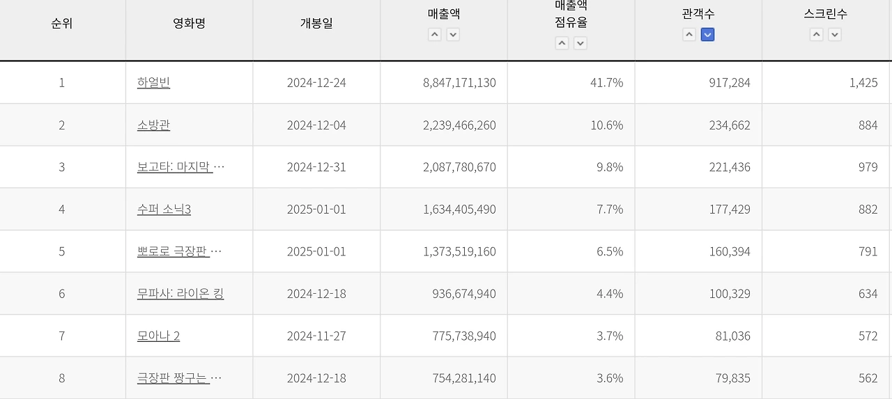 극장 입장 수익 (출처=영화관 입장권 통합 전상망 KOBIS)