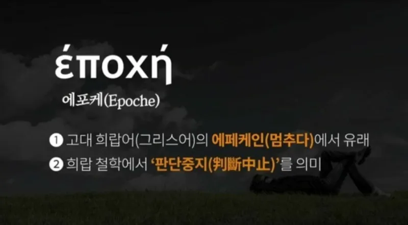 그리스 회의주의 철학자들이 말했다는 '에포케'는 '잠시 멈춤'이라는 뜻이다. 논쟁이 거듭될 때 이쪽의 말을 들으면 이쪽이 맞는 것 같고, 저쪽의 변을 들으면 저쪽이 타당하다 느껴질 때가 있다. 황희 정승의 시시비비가 생각나고 이어령 비어령도 떠오르는 순간이 삶에 비일비재하다. 20세기 와서 에드문트 후설이 주장한 현상학적 에포케도 이와 마찬가지다. 노에마(나에 의해 파악된 본질)는 노에시스(나의 주관)가 그것을 어떻게 파악하느냐에 따라 드러난다는 주장이다. 그래서 이런 판단의 시점에는 '판단의 보류'라는 에포케가 필요하다는 주장이다.
