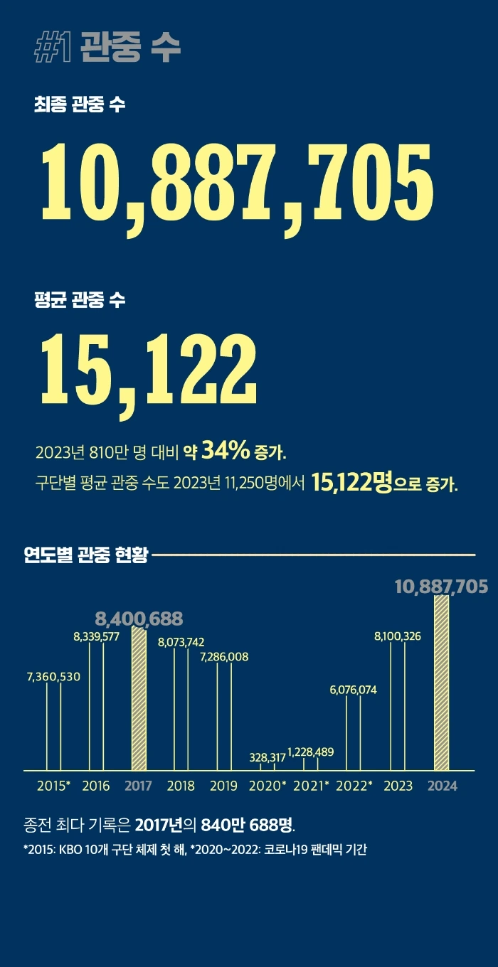 천만 관중 돌파라는 경이로운 기록은 2024년 KBO 리그의 빛나는 성과였다. 이는 단순한 숫자를 넘어, 야구에 대한 식지 않는 팬들의 열정을 증명하는 웅변적인 외침이었다. 치열한 순위 경쟁, 팬 친화적인 마케팅 전략, 그리고 젊은 여성 팬들의 유입 증가는 이례적인 흥행을 견인한 주요 요인으로 분석된다. 안전하고 쾌적한 경기장 환경 또한 팬들의 발길을 붙잡는 데 결정적인 역할을 했다.