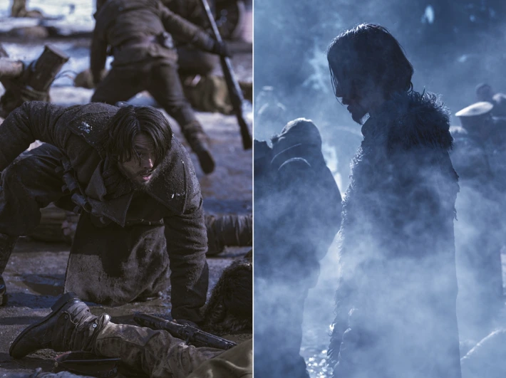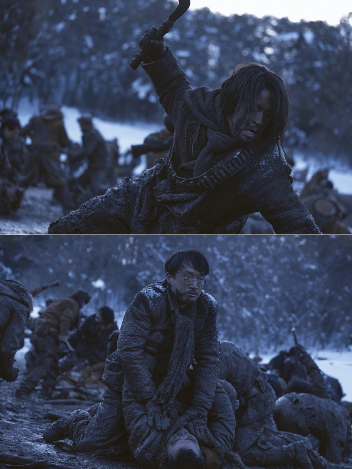 영화적 기표는 오감을 향해 돌진한다. 화면의 색감, 조명의 질감, 카메라의 속도 변화(슬로모션, 정지 화면 등), 음향의 미세한 디테일 등은 관객의 감각을 즉각적으로 깨우는 강력한 힘을 지닌다. <하얼빈>의 초반부 전투 장면은 이러한 감각적 기표들을 극한까지 밀어붙인다. 폭발음과 총성, 쓰러지는 병사들의 비명, 고통으로 일그러지는 얼굴들이 슬로모션과 강렬한 명암 대비 속에서 재현된다. 이 순간, 기표들은 마치 자신들이 수행해야 할 서사적 역할에서 벗어나, 그 자체의 존재감을 과시하는 것처럼 느껴진다. 화려하고 강렬하며, 그 자체로 완결된 이미지의 파편들처럼 말이다.