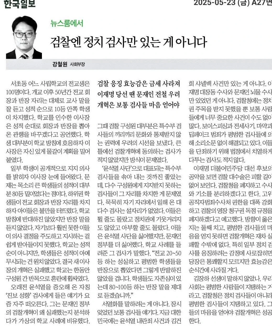 한국일보 강철원 기자는 문재인 정부 시절 이루어진 검찰개혁이 실패한 이유를 ‘표(衆)의 마음을 고려하지 않은 일방적 인사 교체’ 비유를 통해 설명한다. 즉, 어느 학교의 사례를 들어 ‘교사 말 잘 듣고 성적 우수한 학생’(기존 특수부 검사 그룹)을 몰아내고 ‘목소리 크지만 성적 낮은 학생들’(문재인 정부에 협력적이지만 역량·지지를 충분히 받지 못한 검사들)을 기용하자, 교실 내에서는 반목과 불신이 생겼다는 것이다. 이를 통해 기자는 검찰개혁이 ‘정치 검사를 처단’하는 데만 매달리면서 평범한 검사들의 자존심을 무시했고, 그 결과 내부 결속을 무너뜨려 실패했다고 주장한다. 이어 이재명 후보가 제안한 ‘검찰청 폐지·수사·기소 분리·영장 청구권 폐지’ 등 대대적 개혁도 평범한 검사들의 마음을 얻지 못하면 또다시 실패할 수밖에 없다고 경고한다.