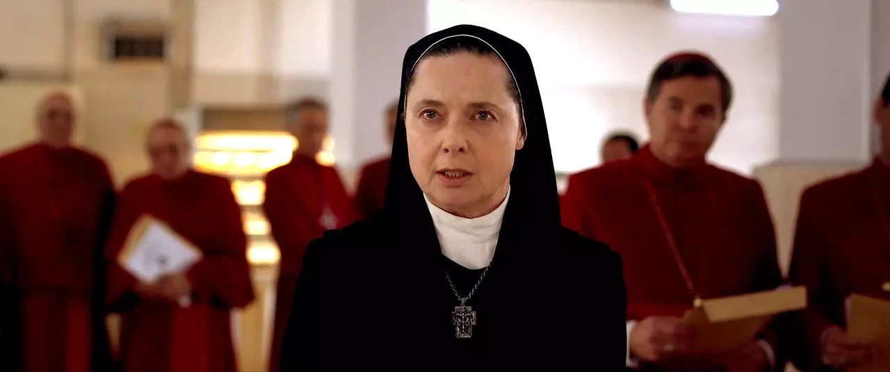 그래서, 이 여정의 끝에 베니테스(카를로스 디에스) 추기경이 교황으로 선출되는 것이 중요해진다. 그는 제3세계(영화는 멕시코, 소설은 필리핀) 출신으로, 서구 중심적 교회 질서에서 주변에 머물던 인물이다. 그리고 그의 도전을 끝내 열어준 이가 바로 아그네스 수녀(이사벨라 로셀리니)다. 여성 수도자, 더욱이 제도교회에서 제대로 발언권조차 보장되지 않는 존재. 이 소외된 이들의 손이, 확신의 사슬을 끊고, 다양성의 문을 연다.