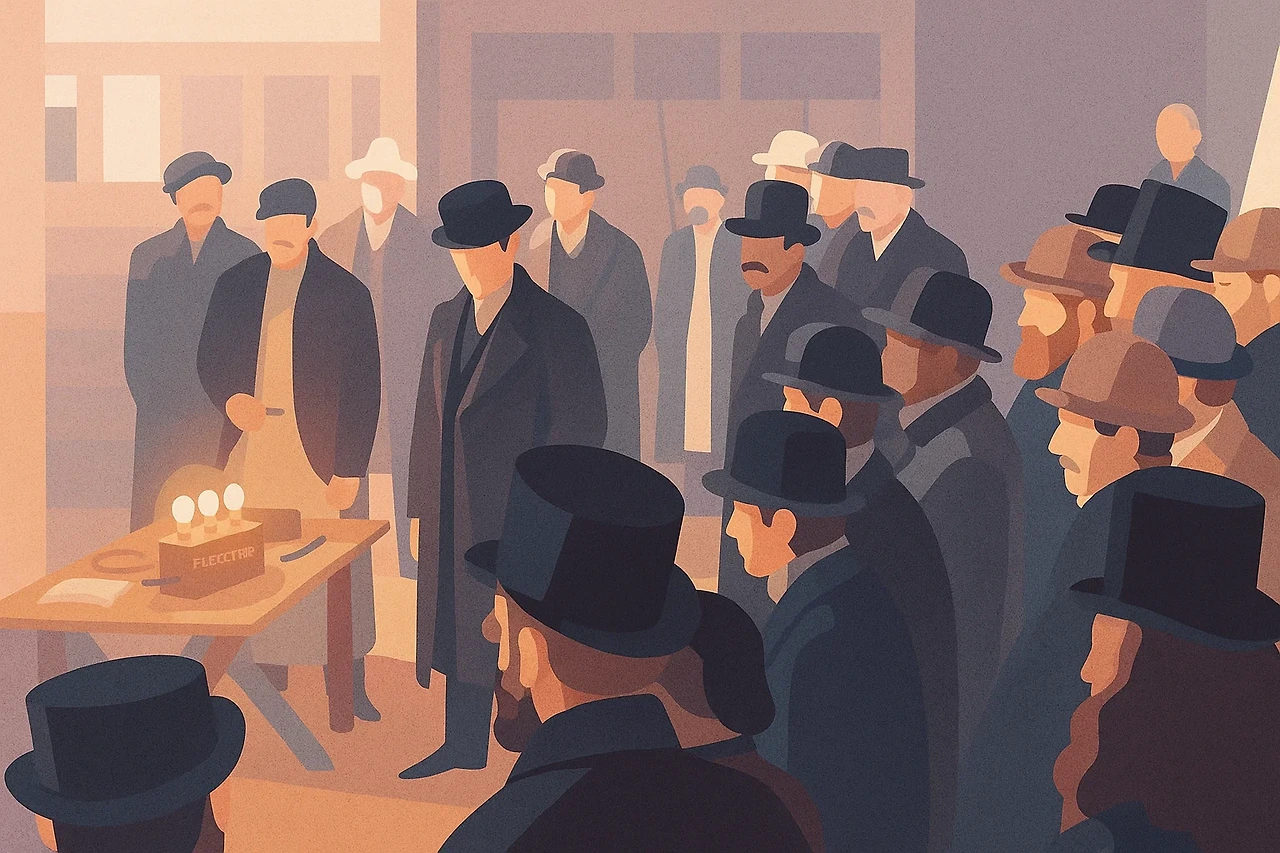 멘로파크, 뉴저지의 밤하늘 아래 달리는 증기 기관차. 흘러가는 풍경이 역사적 시계를 대신한다. 기관차가 멈추고, 중절모를 쓴 신사들이 질퍽한 땅을 밟으며 내린다. 한 신사가 램프를 끄자, 고요 속에서 “점등!”이라는 외침이 터진다. 원형으로 배열된 전구가 차례로 밝아지고, 그 중심에 에디슨이 서 있다. 그는 손짓 하나로 신사들을 원 안으로 불러들이며 묻는다. “다들 백지수표는 가져오셨겠죠?” 전류의 가능성과 권력, 자본이 순간적으로 시각화되는 장면이다.