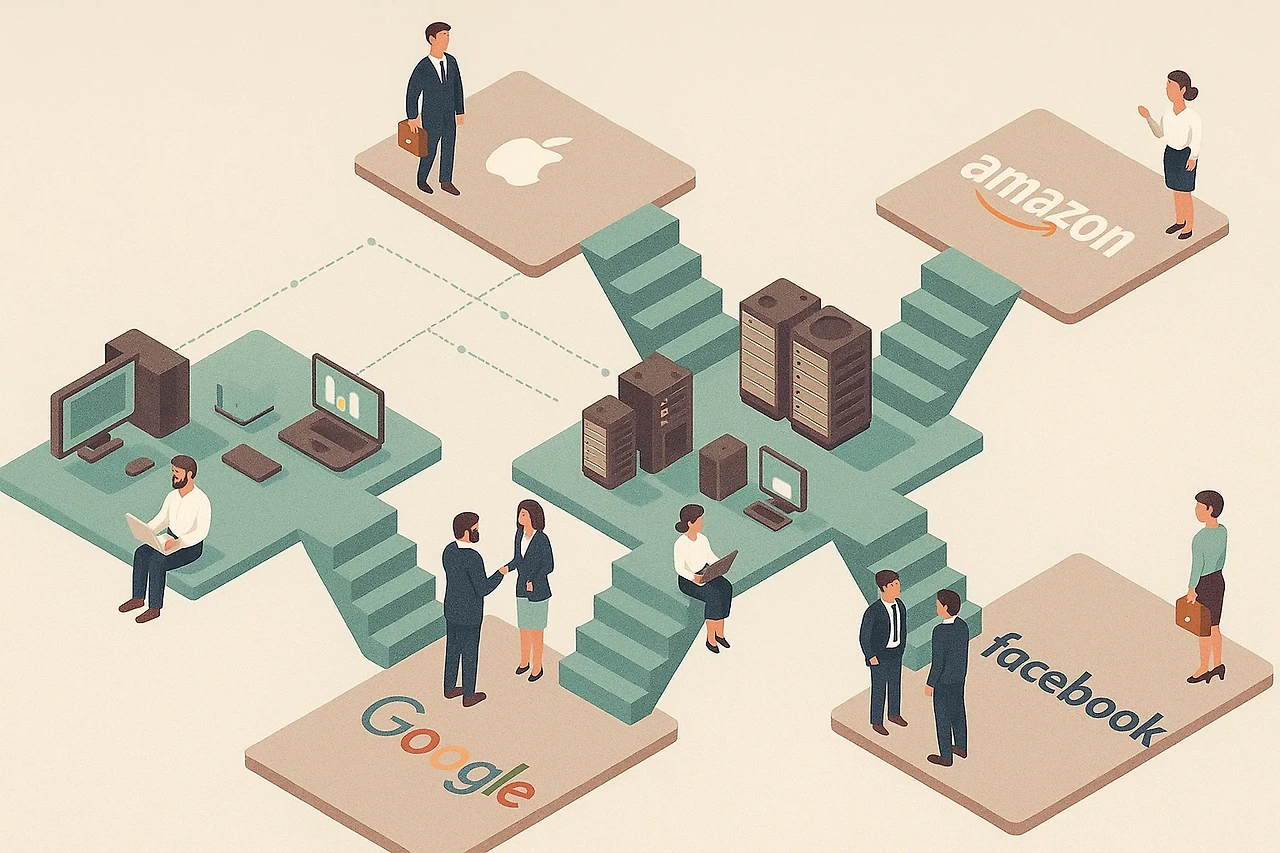 현대 플랫폼 기업, 예를 들어 페이스북, 아마존, 구글, 마이크로소프트는 이러한 권력의 회로를 의도적으로 설계하고 운영한다. 페이스북은 친구와 가족 연결을 넘어 광고 타겟팅, 인스타그램·왓츠앱 통합, 참여 데이터 분석으로 권력을 집중시킨다. 아마존은 온라인 마켓플레이스와 클라우드 서비스, 자체 제품 라인을 결합해 생태계를 강화하고, 구글은 검색, 지도, 드라이브, 광고, 모바일 운영 체제에 걸친 통합 경험으로 시장을 지배한다. 이들 기업은 사용자 경험을 친숙하게 만들고, 변화와 교체를 불편하게 하며, 결과적으로 장기간 플랫폼에 머무르게 한다.