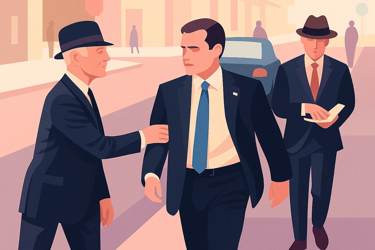 출근길, 그는 낯선 남자들의 행동을 목격한다. 중절모를 쓴 요원들이 도시 곳곳에서 사람들의 동선을 조정하며, 그의 발걸음을 의도적으로 막는다. 그는 곧 ‘조정국’이라는 비밀 조직의 존재를 알게 된다. 조정국은 ‘의장’이 설계한 거대한 계획에 따라 인간의 운명을 관리한다. 사랑, 우정, 직업, 정치적 미래 ― 모든 것은 정해진 궤도를 따라야 하며, 우연한 만남조차 통제된다. 데이비드와 엘리스의 재회는 계획에 없는 변수였고, 따라서 차단되어야 했다.