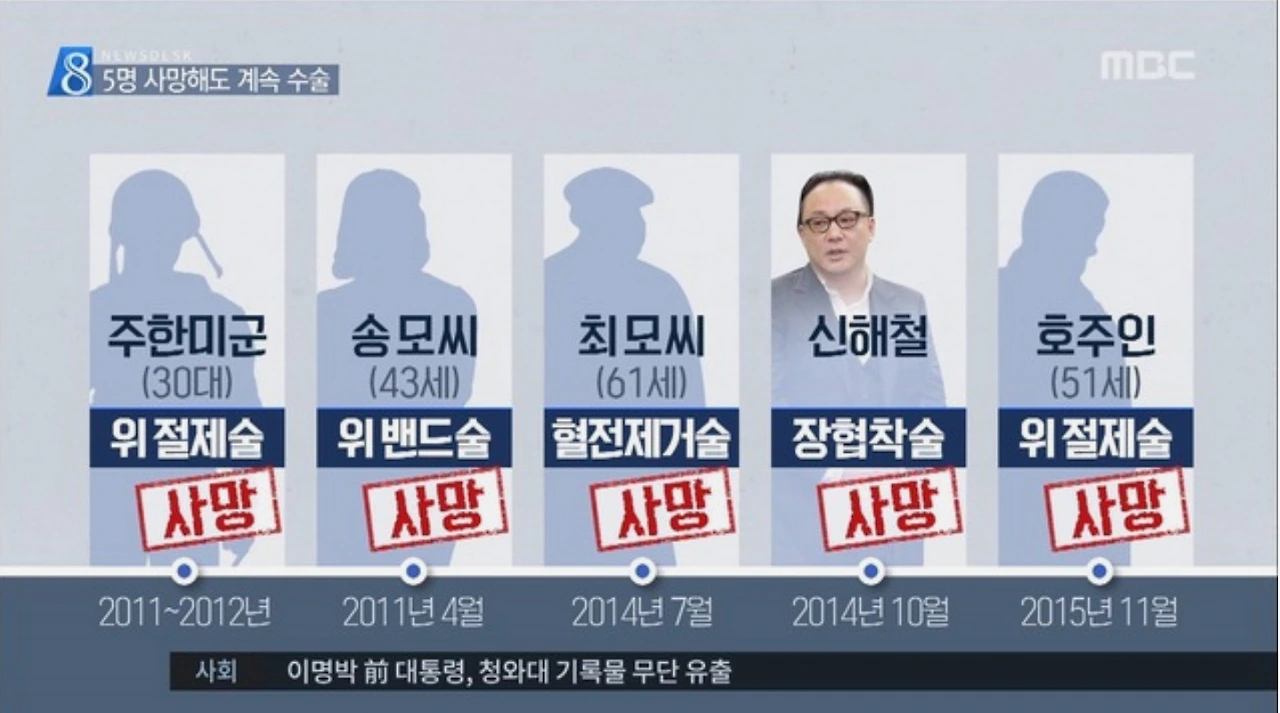 2009년, 그는 모 방송의 다이어트 프로그램을 계기로 몇 년 뒤 사고가 일어날 서울스카이병원에서 위밴드 시술을 받았다. 2014년 10월 17일, 신해철은 위밴드에 문제가 생겨 장협착증 수술을 받았고, 이후 혼수상태에 빠져 10월 26일 사망했다. 당시 주치의는 환자 본인이나 가족의 동의 없이 위축소 수술을 병행한 것으로 드러났다. 국과수 부검 결과, 심낭에 0.3cm의 천공과 위 외벽 15cm 봉합 흔적이 발견되었다. 검찰은 “신해철의 사인은 의료 과실”이라며 집도의를 기소했다.