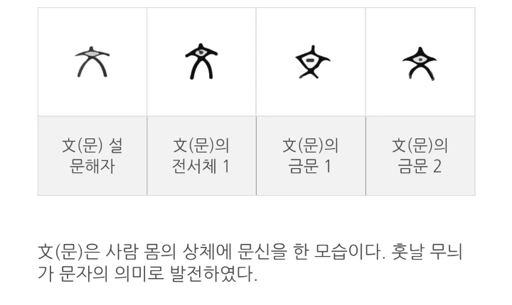 문자학적 계보를 따라가면 ‘글월 문(文)’은 본디 인간의 몸 위에 새겨진 문신, 즉 인위적으로 새긴 무늬나 문양에서 기원한다. 이는 언어 이전의 언어, 몸의 표면에 각인된 최초의 기호라 할 수 있다. 그 문양은 장식이기보다 정체와 소속, 혹은 신앙의 표식이었다. 동시에 인간이 세계와 맺는 관계를 피부 위에 새겨 넣은 문화적 행위였다. 다시 말해, ‘문(文)’은 처음부터 ‘형상의 질서’를 담은 상징적 패턴이었다.