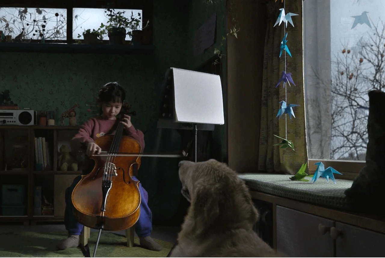 이 감각적 서사는 구범모의 오디오 청음실에서 흘러나오는 조용필의 <고추 잠자리>와 연결된다. 그는 자신을 “아날로그의 인간”이라 소개하며, 진공관과 바이닐을 통해 소리를 듣는다. 그리고 이 감각의 질감은 리원의 첼로 음색과 연결된다. 기술이 모방하지 못하는 불규칙성, 예측 불가능한 떨림, 연주자의 호흡이 만든 흔들림 말이다.
