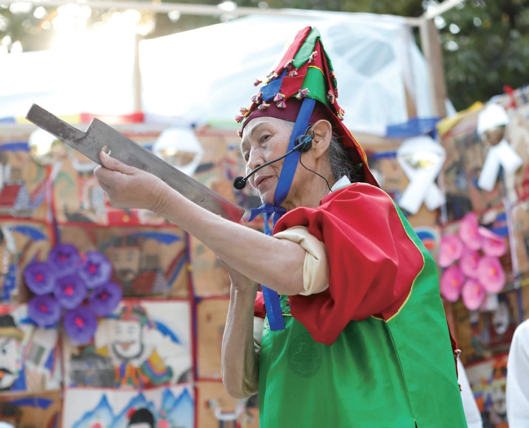 ‘비단꽃길’이라는 역설적 표현은 작두가 날카로운 칼날이자, 신과 인간이 만나는 황홀한 접경지임을 상징한다. 무속의 의미는 개인의 비극적 신체 경험이 전례라는 형식을 통해 공동체의 서사로 확장되는 순간에 발생한다. 접신이라는 비현실적 사건은 전례를 통해 역사와 문화라는 실체를 얻는다.