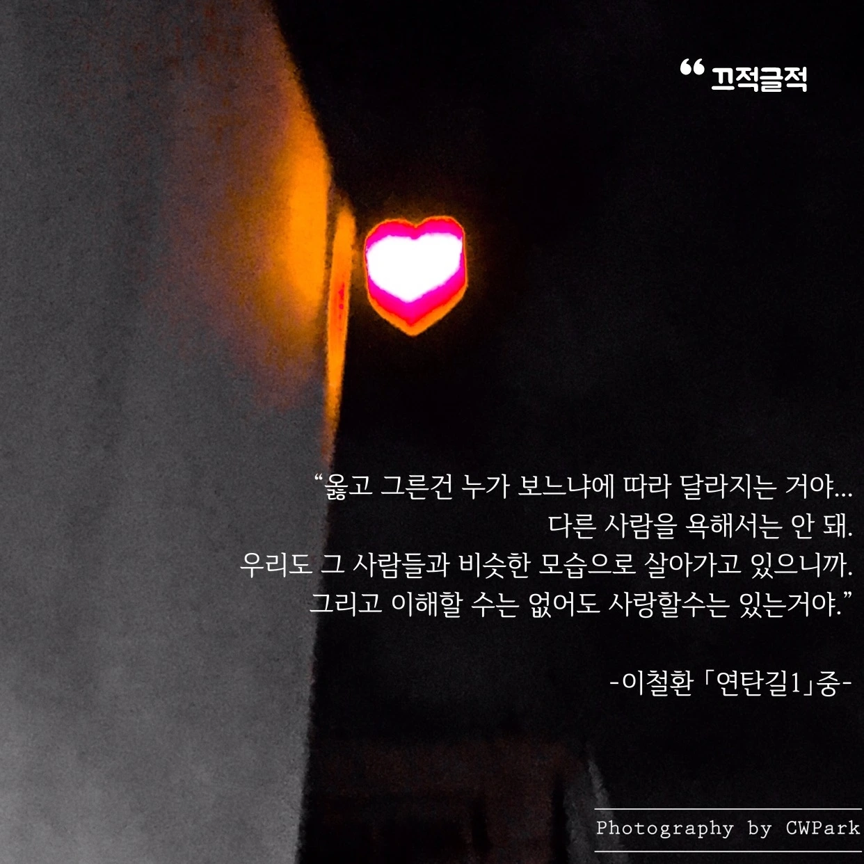 부분을 붙들고 판단하기보다, 온전함을 향해 머무는 것. 그 느리고 서투른 태도 속에서, 사랑은 오늘도 조용히 우리를 기다리고 있다.