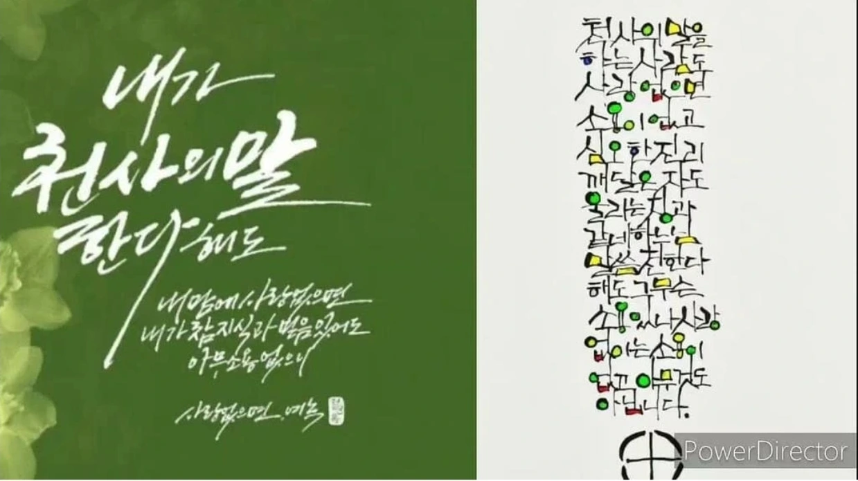 "사랑은 불의에 기뻐하지 않고 진실을 두고 함께 기뻐합니다. 사랑은 모든 것을 덮어 주고 모든 것을 믿으며 모든 것을 바라고 모든 것을 견디어 냅니다. 사랑은 언제까지나 스러지지 않습니다. 예언도 없어지고 신령한 언어도 그치고 지식도 없어집니다. 우리는 부분적으로 알고 부분적으로 예언합니다. 그러나 온전한 것이 오면 부분적인 것은 없어집니다."