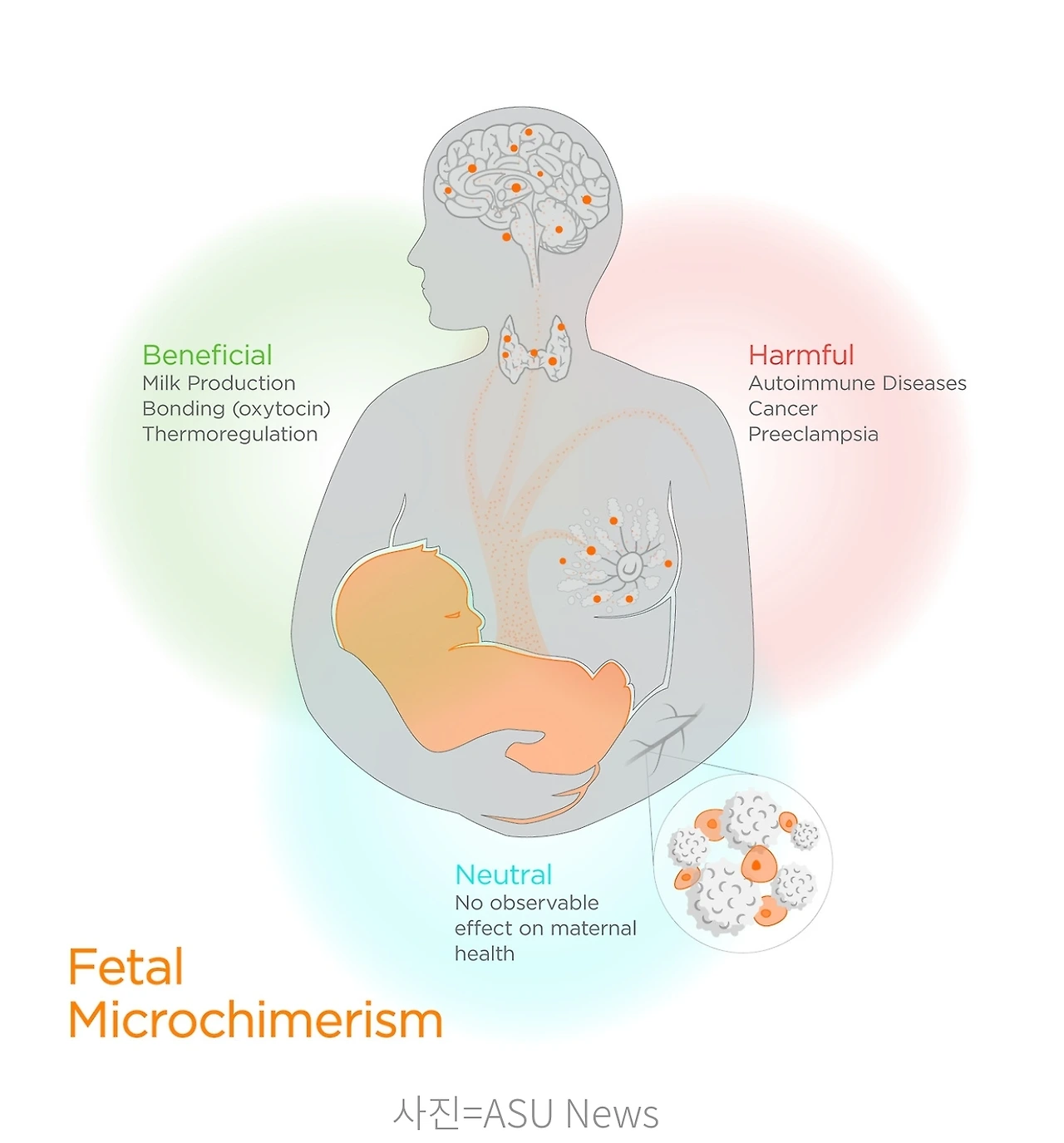 이 현상은 실제 의학적 성과로도 확인된다. 태아의 세포는 엄마의 유방암이나 류머티즘 관절염 증상을 완화하는 데 긍정적인 역할을 하는 것으로 보고되었다. 일부 과학자들은 여성이 남성보다 오래 사는 경향을 보이는 이유를, 태아로부터 전달받은 ‘신선한 세포’ 덕분이라고 설명하기도 한다. 같은 맥락에서, 모체에 유입된 태아의 세포가 어머니의 심장 손상을 회복하는 데 기여했다는 연구 결과도 이어졌다.