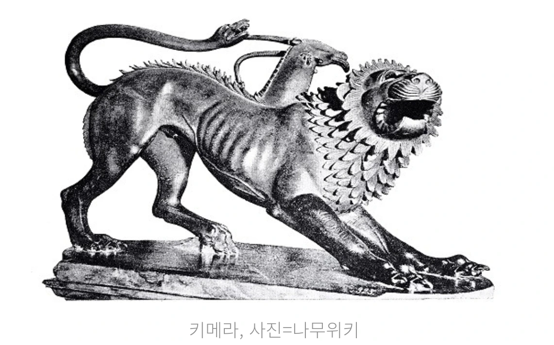 인류의 상상력은 언제나 자연의 질서를 해체하고 다시 엮는 방식으로 공포와 경외를 길러 왔다. 그 상상력의 가장 선명한 결정체 가운데 하나가 그리스 신화의 괴수 키메라(Chimera)다. 호메로스의 『일리아스』에 처음 또렷이 등장하는 이 존재는 앞은 사자, 몸통은 염소, 꼬리는 뱀의 형상을 지녔고, 입에서는 불꽃을 토해낸다. 이 기괴한 혼종성은 단순한 괴물의 외형을 넘어, 고대인이 감지했던 통제할 수 없는 자연의 야생성과 경계를 침범하는 존재에 대한 근원적 두려움을 응축한다.