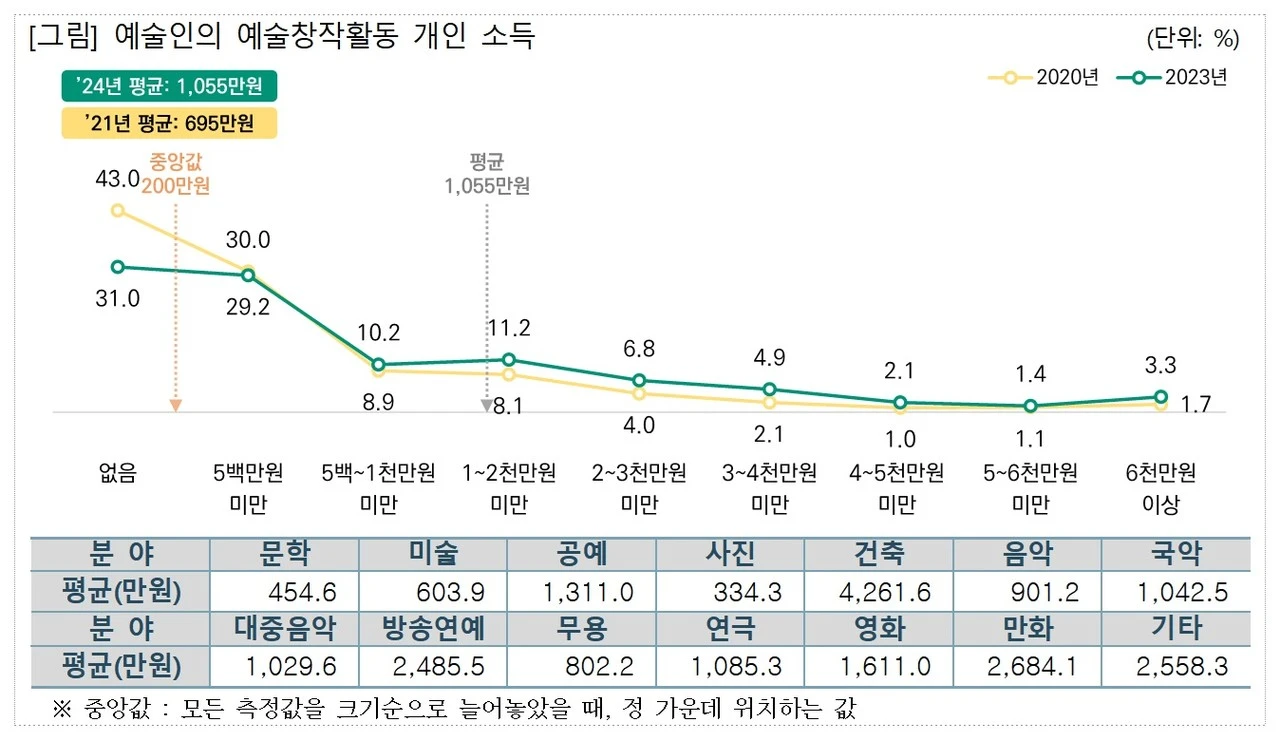 2024년 말부터 2025년 초까지 진행된 '2024 예술인 실태조사'는 그 현실을 수치로 드러낸다. 2023년 기준 국내 예술인의 평균 연소득은 1,055만 원. 국민 1인당 평균 연소득 2,554만 원의 41.3%에 머문다. 이 격차는 단순한 숫자가 아니다. 한 사람이 자신의 시간을 어디에 쓰고, 무엇을 포기하며 살아가는지에 대한 기록이다.