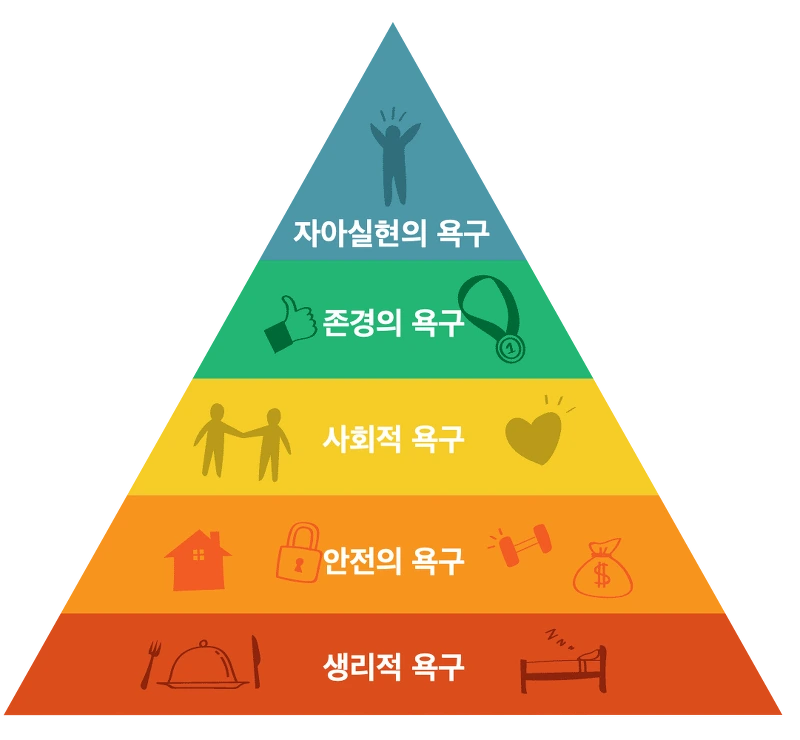 심리학자 메슬로우는 인간의 욕구를 다섯 단계로 설명하고 있다. 피라미드 모양의 바닥의 욕구부터 그 위로 상향할수록 가치를 부여하는 욕구들로 이루어져 있다 설명한다. 가장 첫 번째 욕구는 ‘생리적 욕구’이고, 2단계가 ‘안전의 욕구’, 3단계가 ‘소속, 애정의 욕구, 4단계‘존경의 욕구’, 그리고 마지막으로 ‘자아실현의 욕구’로 구분되며, 하위의 욕구가 충족돼야 상위의 욕구가 실현 가능해진다는 이론이다.
