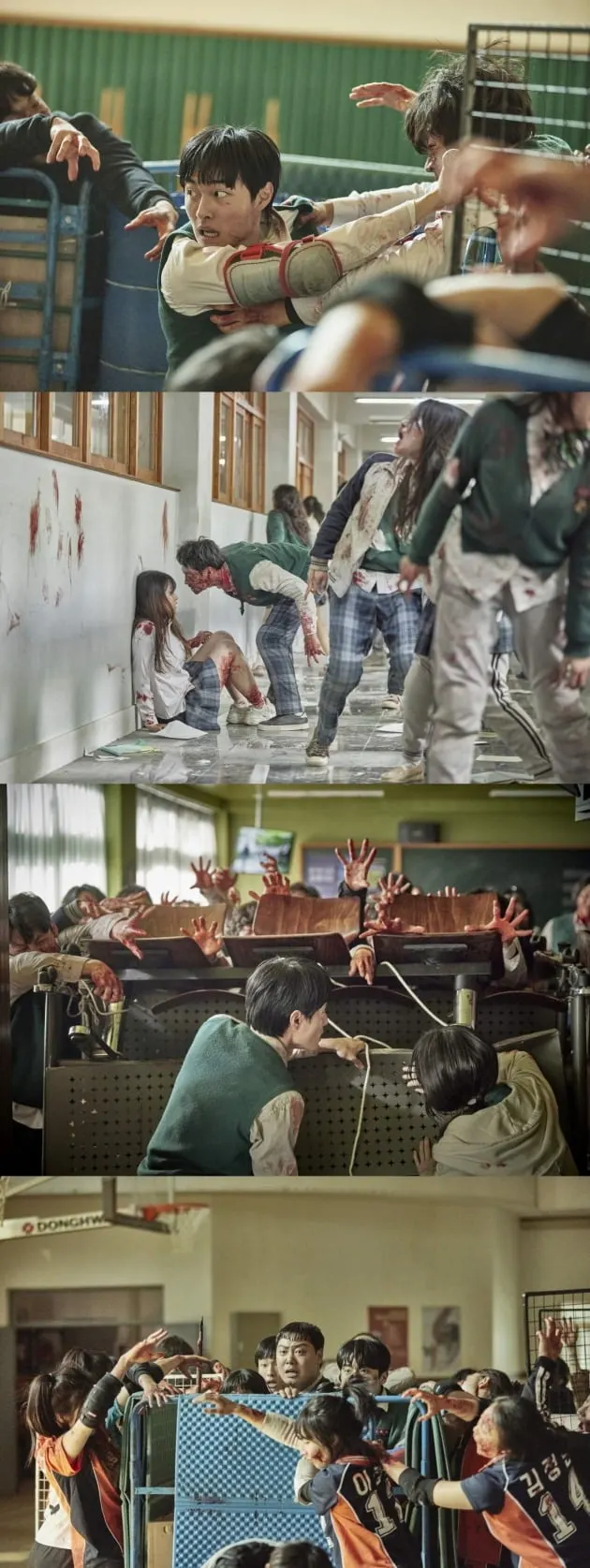넷플릭스 <지금 우리 학교는>은 이러한 좀비 장르의 전형적인 코드들을 담아내고 있다. 각자의 삶의 모습으로 다양한 군상으로 하루를 학교에서 보내는 학생들이지만, 바이러스가 퍼지고 감염자가 생기면서 이들의 고민과 궁리의 목적은 단순하게 이분되어 버린다. 아직 감염되지 않은 자를 물어뜯거나, 감염된 좀비들이 접근하지 못하게 해서 안전한 피난처로 도달하는 것, 이 두 가지 이외에는 어떠한 욕구도 개입하기 어렵다. 이러한 이유로 좀비물에서는 복잡한 심리적인 교착이나 애정의 전선 따위는 필요하지 않다(연상호 감독의 3부작 <부산행>, <반도>, <지옥>이 간과한 지점). 각자의 삶의 모습을 살짝살짝 보여 주면서 다양한 군상들이 결국은 이 본능적인 모습으로 귀결된다고 무뚝뚝하게 말할 뿐이면 된다.