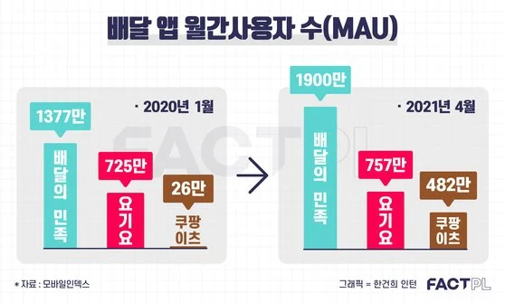 : 배달 중계 업체는 배달 수요와 라이더 공급, 그리고 배달 수수료의 조절을 위해 '픽픽픽픽배배배배'라는 '묶음배송'이 기본이었지만, 투자 자본 공룡 쿠팡이츠가 "한건 배달"이라는 서비스를 출시하자, 배달의 민족은 '배민1(원)', 요기요는 '익스프레스'라는 단건, 혹은 소수 묶음 배달을 경쟁적으로 시작.