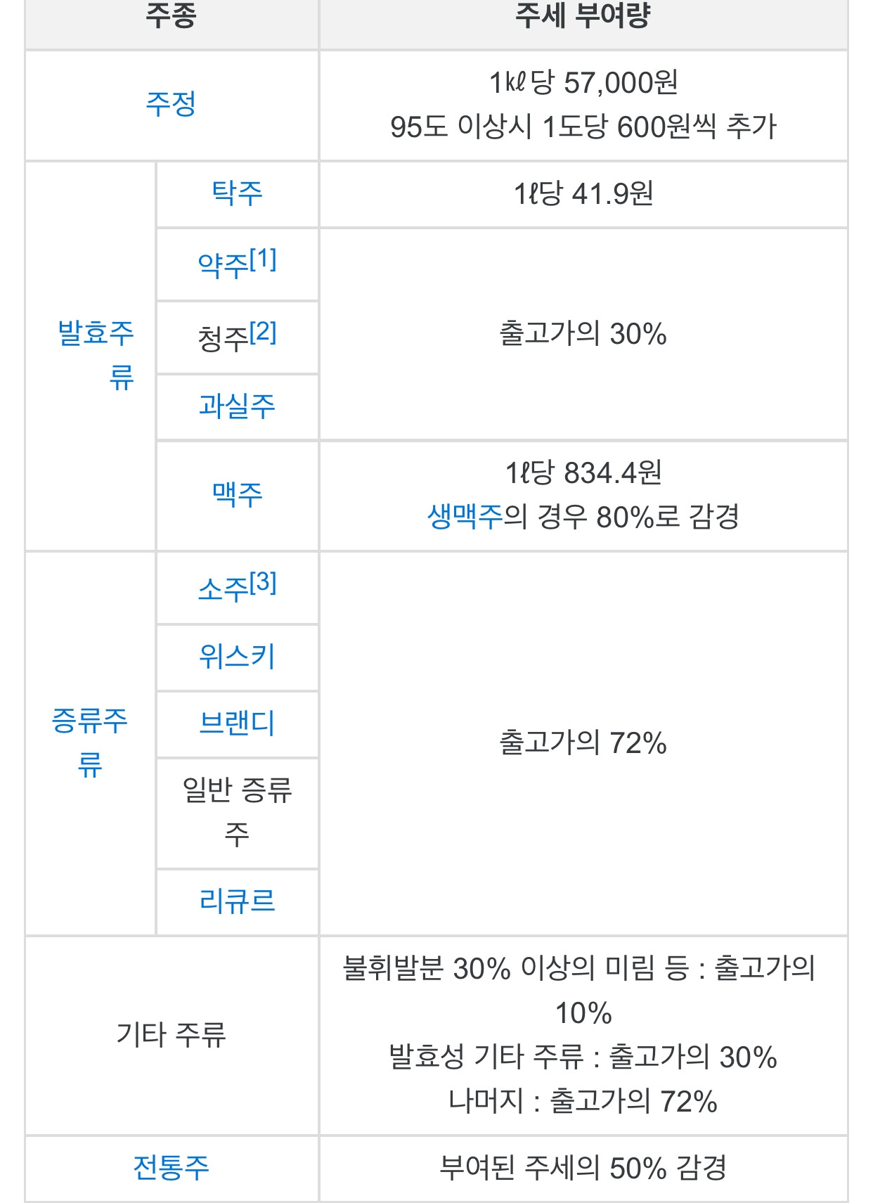 한국의 주세는 상당히 높은 편입니다. 간접세인 수입 관세도 연동됩니다. 한국 맥주의 맛의 이유(맛없다는) 주세 때문이라는 주장도 있으며, 증류주의 주세는 더욱 높아 위스키가 부자들이나 마시는 술이라는 인식을 만드는데 크게 한 몫했습니다(수입양주=사치품). 대개의 나라에서는 독한 술일수록 주세가 많이 붙는데 우리나라는 소득 수준이 올라간 지금도 소주와 맥주가 거의 같습니다. 이유는 국민 정서, 쉽게 말해 표 때문이랍니다. 알코올 의존성 관련 문제는 주세 인상이 먼저 40도 이상이 넘는 주류부터 올리기 시작한다는 것입니다. 과음, 폭음이 고도수 증류주 때문이라기보다는 희석식 소주의 과음 때문일 가능성이 높다는 것을 생각해보면 말도 안 되는 소리가 됩니다.