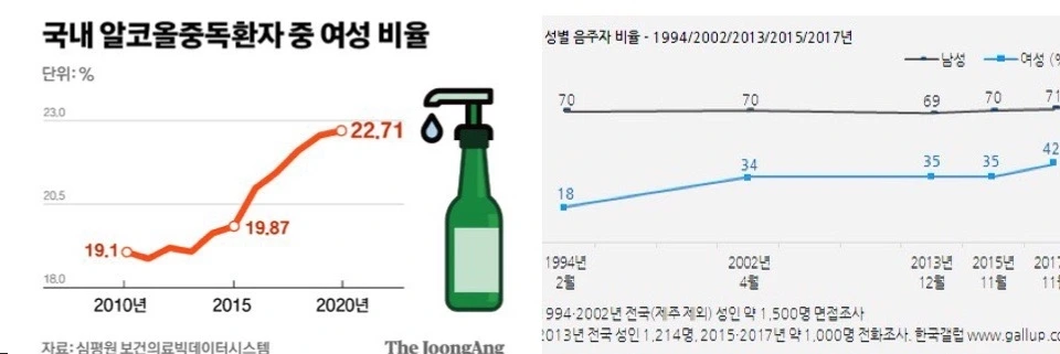 절제하지 않는 음주의 폐해는 잘 알기에 언급하신 약사님의 칼럼의 전반 내용과 결말에 동의가 됩니다. 특히 '고위험군 통계'는 참 중요 지표인데, 최근 음주 인구가 전반적으로 준다 해도 고위험군은 여전하며, 특히 청소년과 여성의 편입이 늘어난 것은 시사하는 바가 크다고 생각합니다. 여성의 경우 알코올 중독자 성비에서 점유가 높아진 것은 여성 음주 비율이 자체 상승했으니, 자연 증가분이라고 볼 수 있으나, "고위험"군이 그 수치보다 상회한다면, 유심히 지켜볼 필요가 있을 듯합니다. (물론 설문, 먼접 조사의 한계는 있겠지만)