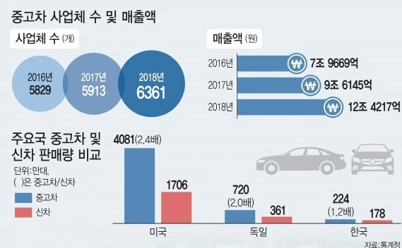 국내에서는 중고차가 신차보다 많이 판매. 카이즈유 데이터 연구소에 따르면 작년 국내 중고차 등록 대수는 394만대로, 신차 173만 대보다 2배 이상. 연간 중고차 거래액은 25조~30조 원에 이르는 것으로 추산.