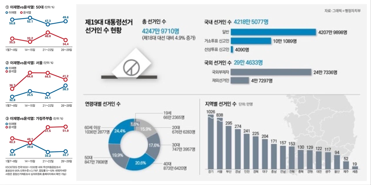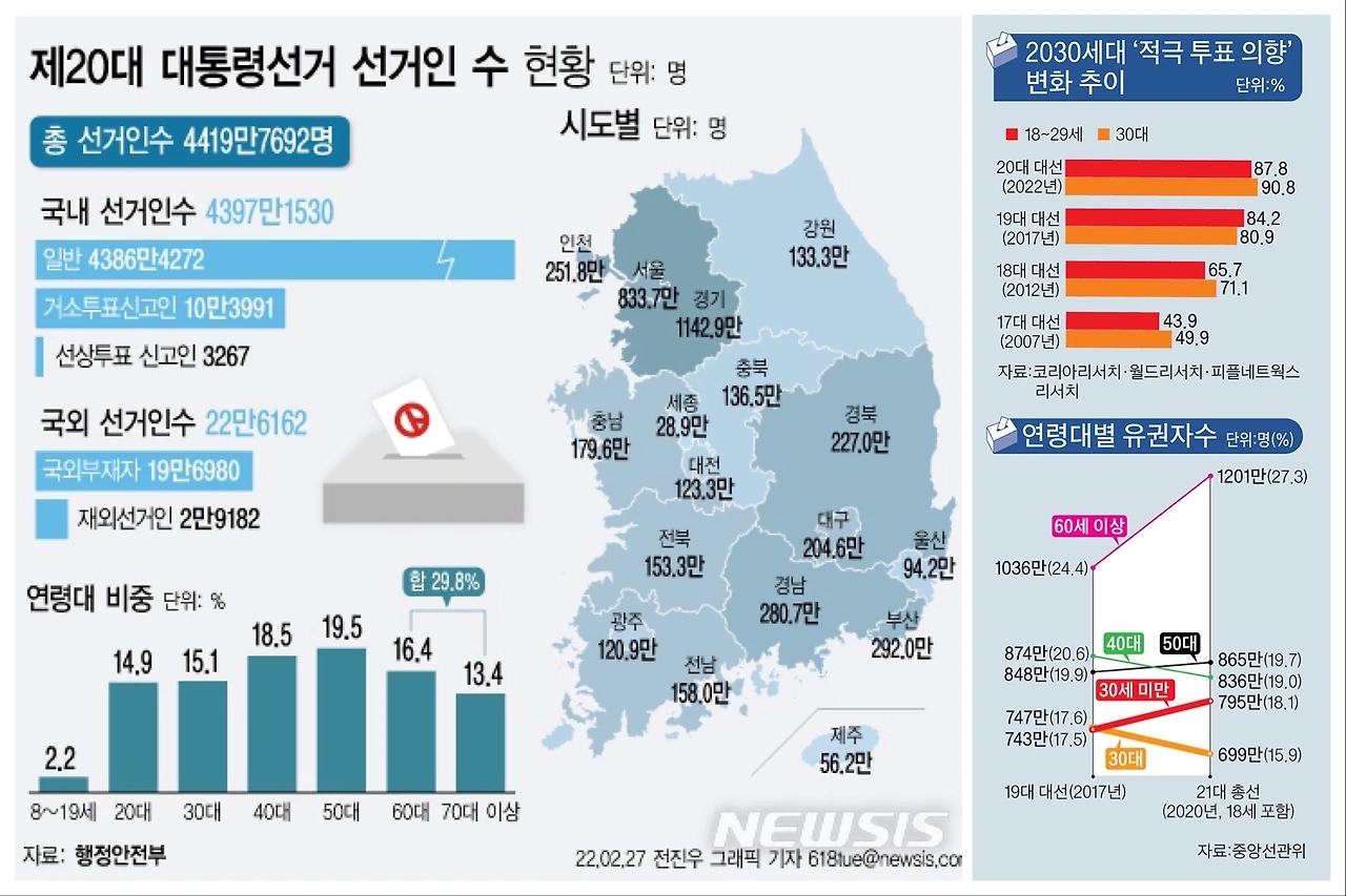 이번 대선 유권자 수는 21대 총선(4399만 4247명)보다 20만 3445명 증가했다. 19대 대선(4243만 2413명)과 비교하면 171만 7982명 늘었다. 국내 선거인명부 기준 연령별 유권자를 보면 Δ18~19세 98만 명(2.2%) Δ20대 659만 명(14.9%) Δ30대 667만 명(15.1%) Δ40대 815만 명(18.5%) Δ50대 862만 명(19.5%) Δ60대 722만 명(16.4%) Δ70대 이상 590만 명(13.4%)이다. -기사 본문 중-