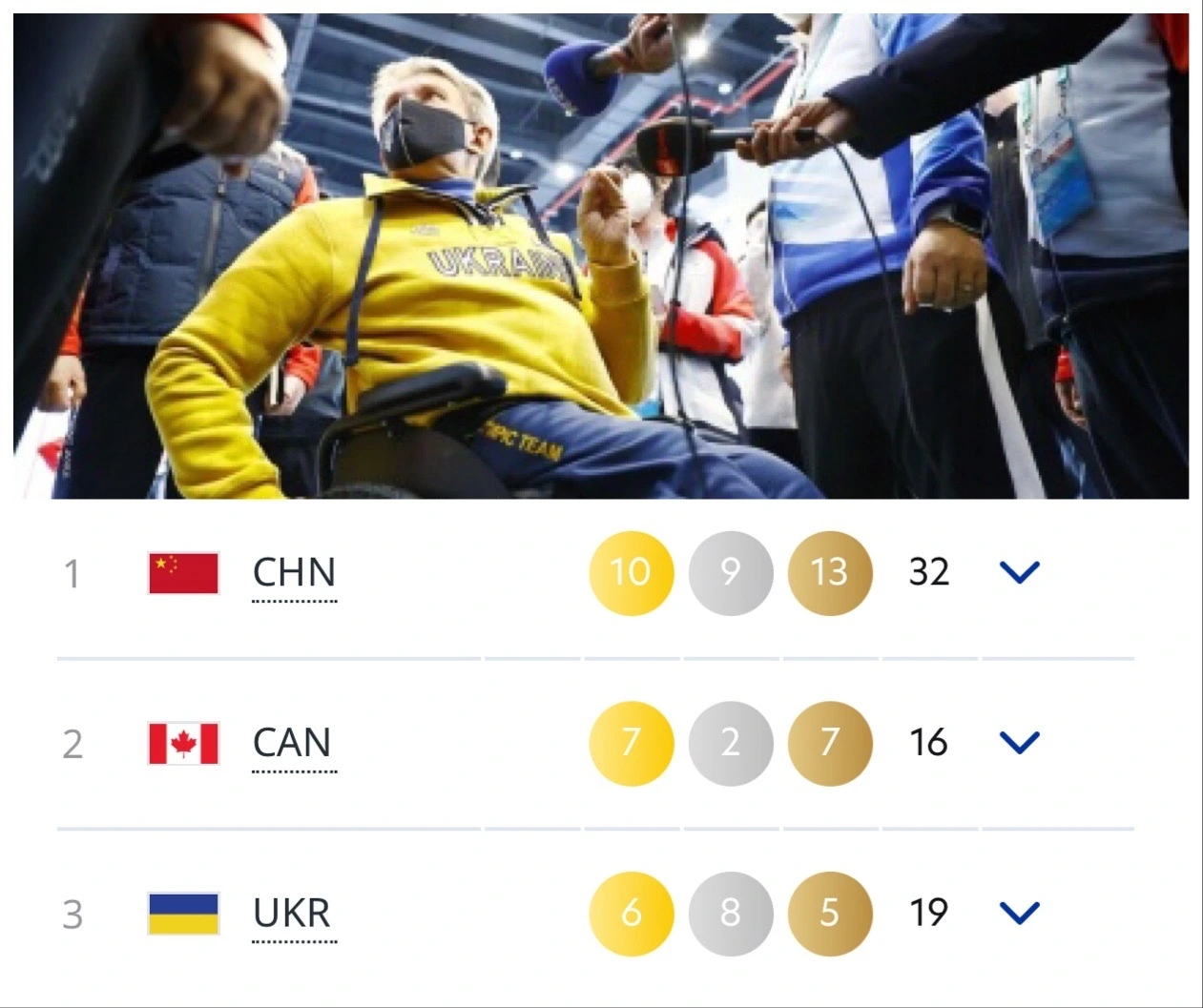 우크라이나는 지난 하계 베이징올림픽(비장애인)에서는 은메달 1개를 거두었지만, 이번 2022 베이징 패럴림픽에서는 그 성적이 다른 양상으로 시작합니다. 6일 차인 11일까지 우크라이나는 바이애슬론과 크로스컨트리에서 총 19개의 메달(금 6·은 8·동 5)을 따냈습니다. 메달 총개수로는 중국, 캐나다에 이어 3위, 메달 색을 기준으로 개최국 중국에 이어 46개 참가국 가운데 2위 성적입니다.