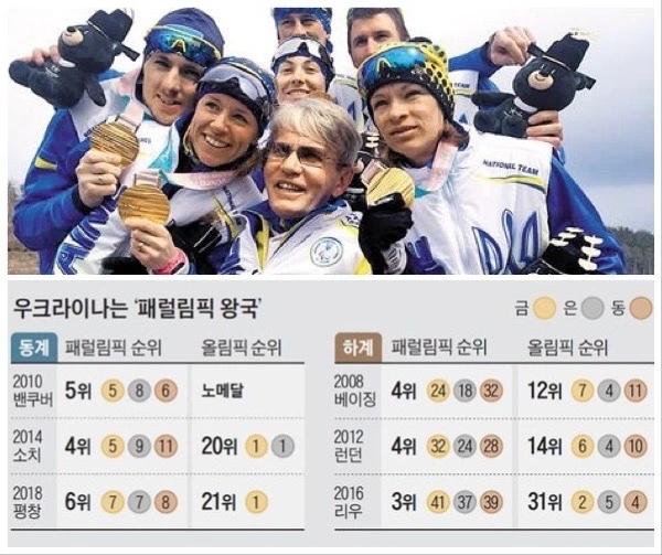 사람들이나 일부 언론들은 '전쟁 속의 고국에 대한 애국심'의 발로라고 합니다. 아주 틀린 말은 아닐 수도 있으나, 그것이 전부라는 것은 짐작에 국한됩니다. 우크라이나는 패럴림픽 등 장애인 스포츠 강국으로 우뚝 선지 꽤 오래되었습니다. 2020 도쿄 패럴림픽 6위(금 24·은 47·동 27), 2018 평창 겨울 패럴림픽 6위(금 7·은 7·동 8) 등 2004년 아테네 대회 이후 17년간 여름, 겨울 패럴림픽에서 6위 밖으로 밀려난 적이 없었습니다.