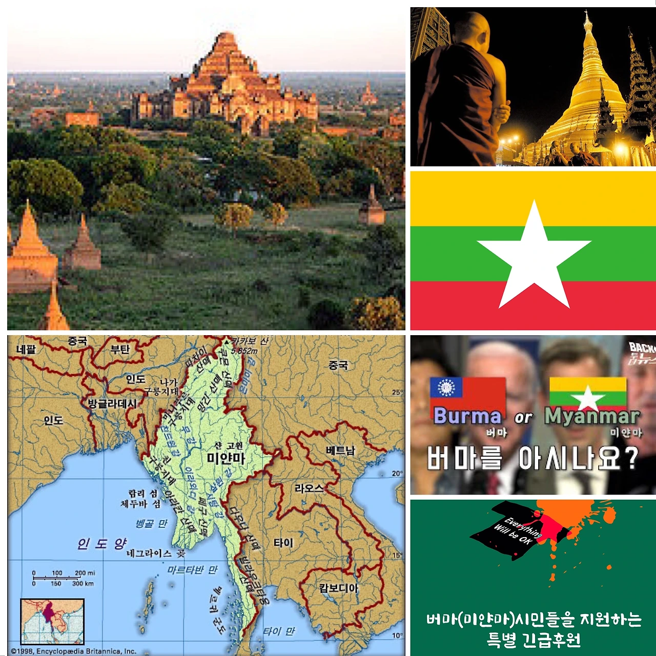 '미얀마'보다 '버마'가 익숙한 세대입니다. '버마'로 기억되던 불교의 나라 '버마'는 1988년 미얀마 군사 정권의 집권으로 '미얀마 연방'으로 개칭되었다가, 2010년부터 정식 국명이 '미얀마 연방 공화국(ပြည်ထောင်စု သမ္မတ မြန်မာနိုင်ငံတော် / Pyidaunzu Thanmăda Myăma Nainngandaw)'으로 변경되었습니다. "미얀마 군사 정권"이 20년 만에 2010년 총선거를 앞두고 국기와 정식 국명을 변경한 것이지요.