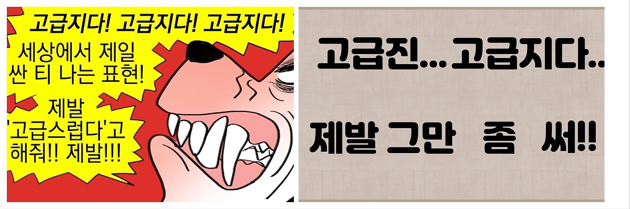 한때 개그 콘서트 코너와 요리 사업가 백종원 씨가 '고급지다~'라는 말을 유행어처럼 쏟아 내던 때가 있었습니다. 사실 '고급지다'는 표준어도 아니고, 제대로 된 단어인 '고급스럽다'의 "~스럽다"만 강조하는 개념처럼 다가와 사용을 추천드리지 않습니다. 오히려 '천박'해 지는 말이 되는 것이지요.